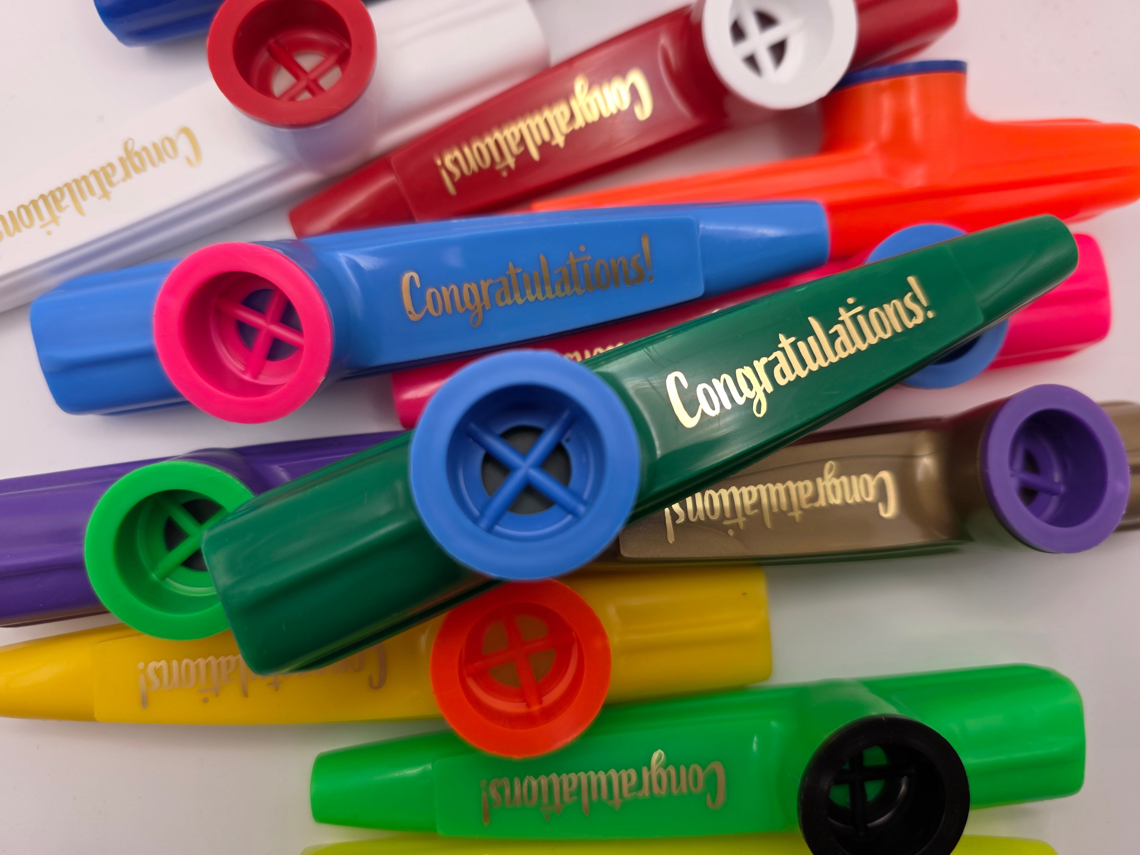 This is our high-quality plastic kazoo imprinted with the message, "Congratulations!".Perfect of graduations - from kindergarten to college.Play "Pomp and Circumstance" for the graduate.